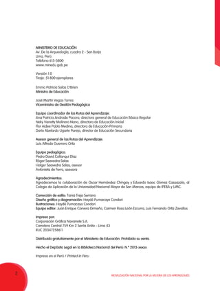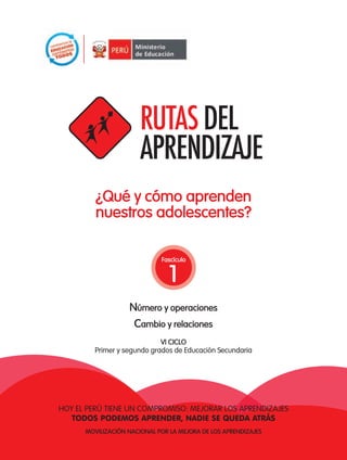 El documento presenta las 'rutas del aprendizaje', una iniciativa del Ministerio de Educación de Perú para mejorar la enseñanza de matemáticas en la educación secundaria, centrándose en el aprendizaje de todos los estudiantes. Se abordan enfoques sobre cómo enseñar y aprender matemáticas, con énfasis en la resolución de problemas y la aplicación a situaciones cotidianas. El objetivo es transformar las prácticas educativas, facilitando el desarrollo de competencias y capacidades matemáticas integrales y pertinentes.