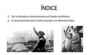 1) Mussolini consolidó su poder en Italia entre 1922 y 1924 mediante la supresión de sindicatos, oposición y resolviendo la crisis económica. Esto llevó a Italia a convertirse en un Estado totalitario entre 1924 y 1926 donde Mussolini tenía poderes ilimitados.