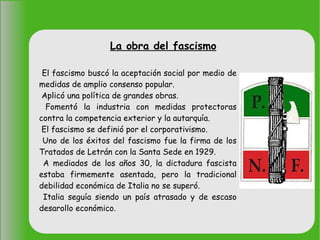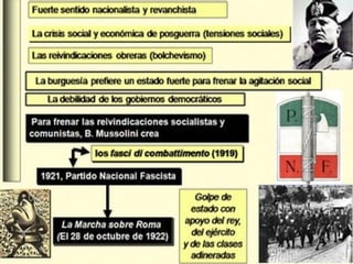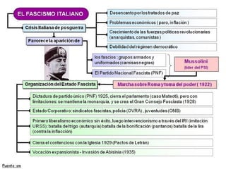 El fascismo italiano surgió en un contexto de crisis económica y agitación social después de la Primera Guerra Mundial. Benito Mussolini y su Partido Fascista tomaron el poder en 1922 a través de la "Marcha sobre Roma" y establecieron un Estado totalitario en 1925, suprimiendo otros partidos y libertades. El fascismo italiano se caracterizó por el autoritarismo, el ultranacionalismo, la propaganda, el racismo y la intervención estatal en la economía para lograr la autarquía.