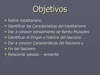 El documento describe el origen y las características del fascismo en Italia. Explica que después de la Primera Guerra Mundial, Italia sufría una crisis económica y política que llevó a Benito Mussolini a establecer el fascismo como movimiento. El fascismo se opuso a la democracia y socialismo, centralizó el poder en el estado bajo un líder autoritario, y usó la violencia y propaganda para ganar seguidores. El fascismo italiano estableció un régimen totalitario que duró hasta el fin de la Segunda Guerra M
