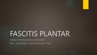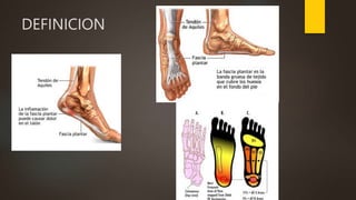 Este documento define la fascitis plantar como una inflamación aguda de la aponeurosis plantar del pie, causada típicamente por microtraumatismos repetitivos como resultado de actividades deportivas o caminar con calzado inadecuado. Los síntomas incluyen dolor localizado en la planta del pie que empeora con la presión o al levantar el pie. El tratamiento conservador como estiramientos, fortalecimiento muscular, soportes plantares y antiinflamatorios suelen ser efectivos en el 80-90% de los casos.