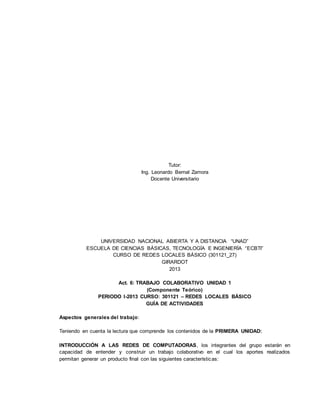 Este documento describe una actividad colaborativa de dos fases para un curso de redes locales. En la primera fase, los estudiantes crearán presentaciones individuales en SlideShare sobre los diferentes medios de transmisión guiados y no guiados. En la segunda fase, trabajarán en grupo para hacer un cuadro comparativo de los diferentes tipos de modulación, incluyendo sus características, ventajas y desventajas. El documento proporciona información sobre cada tipo de modulación para guiar el trabajo del grupo.