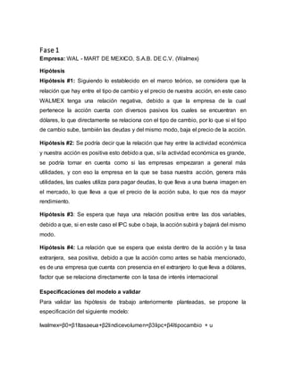 El documento analiza la relación entre el tipo de cambio, la actividad económica y el comportamiento de las acciones de Wal-Mart de México (Walmex) a través de diversas hipótesis. Se propone un modelo de regresión lineal para evaluar cómo factores como la tasa de interés, el IPC y el volumen de comercio influyen en el valor de las acciones de Walmex. Los datos utilizados cubren un período desde enero de 2004 hasta agosto de 2018, con un total de 875 observaciones para evaluar las hipótesis planteadas.