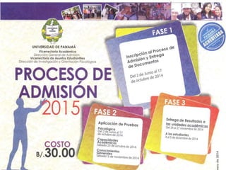 El documento proporciona instrucciones y recordatorios para el proceso de admisión de 2015. Incluye pantallas de la aplicación web para ingresar datos de estudiantes, imprimir constancias de pago y cambiar opciones de carreras. También indica que solo se aplicarán pruebas a estudiantes inscritos y que los resultados son válidos por un año. Resalta la importancia de verificar los números de cédula antes de enviar las hojas de respuesta.