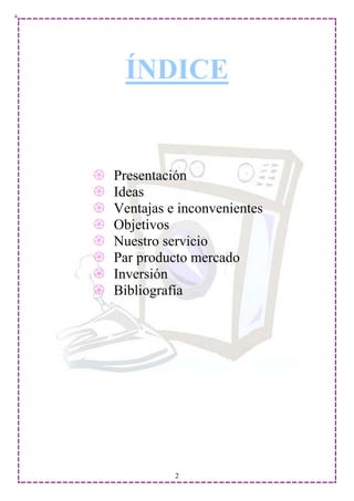 Este documento presenta el proyecto empresarial de una lavandería propuesto por un grupo de 4 jóvenes estudiantes. Detalla las 5 ideas iniciales consideradas y explica por qué eligieron una lavandería. Describe los objetivos y servicios que ofrecería la lavandería, como lavado, planchado y recogida a domicilio. También resume las ventajas e inconvenientes del proyecto.