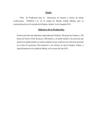 Este documento presenta un plan de producción para la fabricación de guantes y gorros de abrigo para la empresa Confecciones MARSAI C.A. en Mérida, Venezuela para el año 2012. El plan detalla la producción de 500 piezas diarias, especificaciones del producto, proceso productivo, requerimientos de materias primas e insumos, maquinaria, cronograma de actividades y costos estimados. El objetivo es abastecer el mercado de la Región Andina con productos de alta calidad.