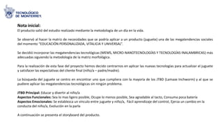 Este documento presenta el desarrollo de un juguete inteligente llamado "Smart Toy" para educar y entretener a niños. El juguete tomará la forma de un gusano con diferentes texturas y la capacidad de emitir luz, sonido e interaccionar con una aplicación móvil a través de Wi-Fi. La aplicación ofrecerá cuentos, música, juegos educativos y control parental. El juguete satisfará las necesidades del niño de manera portable y personalizada mientras fomenta su aprendizaje y desarrollo.