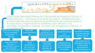 El documento describe las fases del proceso de diagnóstico de un proyecto. La primera fase implica describir el estado actual de la actividad u organización, proyectar su desarrollo futuro si no hay cambios, y evaluar las situaciones actual y futura en comparación con una norma. La segunda fase analiza los problemas identificados al determinar objetivos factibles, identificar factores clave, buscar estrategias y variables externas, y seleccionar criterios para proyecciones.