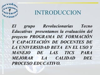 El documento presenta el resumen de un proyecto de capacitación de docentes en el uso de TIC para mejorar la educación en la Universidad Beta en Panamá. El proyecto propone la creación de una estructura organizativa y académica para ofrecer capacitación virtual a los docentes, así como instalar conexión a internet en todos los centros y proveer computadoras a los docentes para implementar el aprendizaje en línea. De acuerdo al grupo, el proyecto es factible y permitirá cumplir las metas en el tiempo planificado si se mit