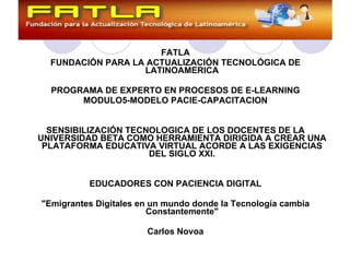 El documento describe un proyecto de capacitación para docentes de la Universidad Beta en el uso de tecnologías de la información y comunicación (TIC) para la enseñanza a distancia, aplicando la metodología PACIE. El proyecto consiste en cuatro módulos de capacitación de dos meses cada uno, con un costo de USD 1200 por docente y financiamiento compartido entre la institución y los participantes. El objetivo es lograr que los docentes usen correctamente las TIC para eliminar las debilidades de la enseñanza no presencial y