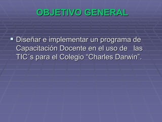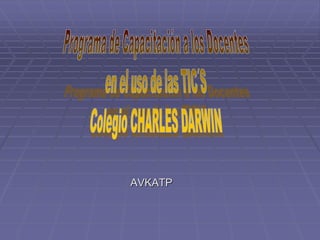 Este documento presenta un programa de capacitación para docentes del Colegio Charles Darwin en el uso de las tecnologías de la información y la comunicación (TIC). El programa tiene como objetivo general diseñar e implementar una capacitación docente en TIC y como objetivos específicos implantar elementos estructurales del programa, capacitar a los docentes en el uso de TIC y construir aulas virtuales por asignatura. El programa consta de seis módulos y tendrá una duración de seis meses con evaluaciones permanentes.