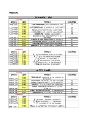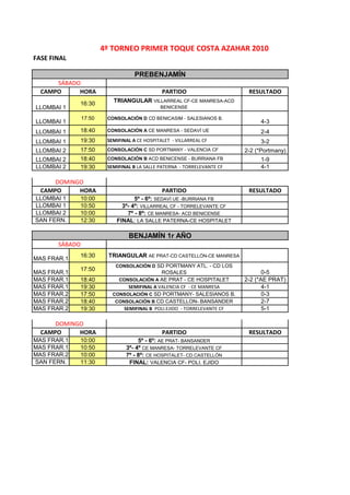 Este documento presenta el calendario de partidos de la fase final del 4o Torneo Primer Toque Costa Azahar 2010 para las categorías prebenjamín, benjamín, alevín e infantil. Se detallan los campos, horarios y resultados de los encuentros de cuartos de final, semifinales, consolaciones y final para cada categoría durante los días sábado y domingo del evento.