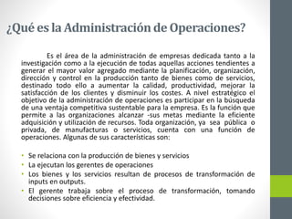 Este documento trata sobre varios temas relacionados con la administración de operaciones. Explica que la administración de operaciones se encarga de la planificación, organización, dirección y control de la producción de bienes y servicios para aumentar la calidad, productividad y satisfacción de clientes. También describe el origen de la investigación de operaciones durante la Segunda Guerra Mundial y su aplicación posterior en el sector civil. Finalmente, define conceptos clave como procesos industriales, productividad, productos y servicios.