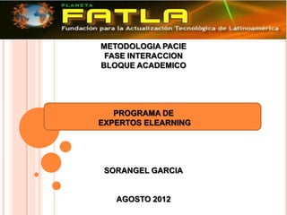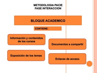 El documento describe el Bloque Académico de la Metodología PACIE. El Bloque Académico contiene información sobre los cursos, documentos compartidos y enlaces. Se divide en cuatro secciones: Exposición, que presenta los temas y materiales; Rebote, para aportes y actividades de los estudiantes; Construcción, para interacción entre participantes; y Comprobación, para verificar los logros de los estudiantes. El Bloque Académico es importante porque permite a los estudiantes acceder a la información del curso y experimentar