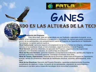El documento describe la cuarta y última fase de evaluación de un Programa de Capacitación en Habilidades Tecnológicas. Se evaluará a nivel institucional, de recursos humanos, de tareas y operaciones, y en general. La evaluación incluye opiniones sobre la aplicación de herramientas tecnológicas en la enseñanza, la ejecución del programa, el desarrollo de docentes, y si el contenido y métodos cubrieron las expectativas. El objetivo es conocer la opinión de los participantes sobre el programa.