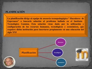 El documento describe un plan para implementar un programa de capacitación docente en el Instituto Tecnológico Gamma basado en el uso de tecnologías de la información y comunicación. El programa capacitará a los docentes en el uso de una plataforma tecnológica e incluirá la instalación de software y equipos.
