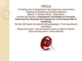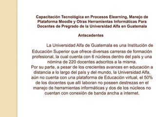 El documento presenta un plan para la capacitación tecnológica de docentes de pregrado en la Universidad Alfa de Guatemala a través de la implementación de una plataforma e-learning basada en Moodle. Se busca diagnosticar las habilidades tecnológicas de los docentes, crear una plataforma virtual, y capacitar en el uso de herramientas TIC. Esto responde a la creciente necesidad de integrar la tecnología en la educación y mejorar la enseñanza a distancia en la universidad.
