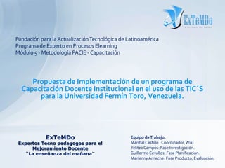 El documento detalla un programa de capacitación en el uso de tecnologías de la información y comunicación (TIC) dirigido a docentes de la Universidad Fermín Toro en Venezuela, con una duración de 190 horas distribuidas en cuatro meses. Este curso se imparte a través de la plataforma de e-learning Moodle y abarca cinco módulos que incluyen temas como comunicación, recursos básicos de Moodle, diseño de cuestionarios e interacción virtual. El objetivo es desarrollar habilidades en los docentes para mejorar la interactividad y la excelencia académica en entornos educativos a distancia.