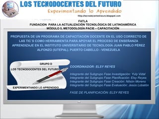 El documento propone un programa de capacitación docente en el uso de las TIC para apoyar el proceso de enseñanza-aprendizaje en el Instituto Universitario de Tecnología Juan Pablo Pérez Alfonzo (IUTEPAL) en Venezuela. El programa incluye cuatro módulos que capacitarán a los docentes en herramientas TIC, la plataforma Moodle, la metodología PACIE y la creación de aulas virtuales. El objetivo es desarrollar competencias digitales que permitan a los docentes incorporar las TIC en sus