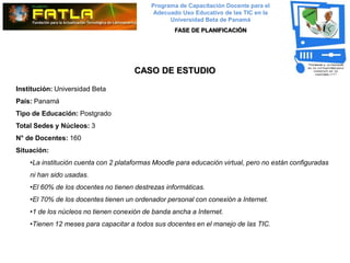 El documento detalla un programa de capacitación docente en la Universidad Beta de Panamá para mejorar el uso educativo de las TIC en un plazo de 12 meses, enfocándose en docentes con escasas habilidades informáticas y la necesidad de implementar plataformas Moodle no utilizadas. Se identifican fortalezas y debilidades en la institución, se establecen objetivos específicos para capacitar a 160 docentes y se define una metodología basada en el modelo PACIE. La planificación incluye un diagnóstico inicial, módulos de capacitación, recursos necesarios y un cronograma de ejecución, con el objetivo de cerrar la brecha digital y modernizar la educación en la universidad.