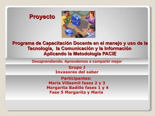 El proyecto de capacitación docente en la Universidad Beta de Panamá busca mejorar el manejo y uso de tecnologías de la información y comunicación entre sus 160 docentes, del cual el 60% carece de destrezas informáticas. Utilizando la metodología PACIE, se propone un programa que incluye la configuración de plataformas Moodle y el desarrollo de competencias tecnológicas en 12 meses. La capacitación abordará aspectos fundamentales como el conocimiento del PC, herramientas informáticas y la implementación de aulas virtuales.