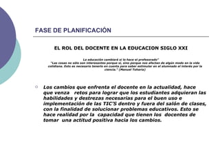 El documento presenta un programa de capacitación para docentes universitarios en el uso de las TIC. El programa consta de cuatro módulos y se implementará en 18 meses con cuatro grupos de 55 docentes cada uno. Se selecciona el Diseño 1 que otorga un título de maestría y reconocimiento económico a los docentes. El programa evalúa aspectos como la formación docente y el costo-beneficio del proyecto.