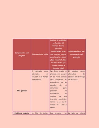 El documento presenta el análisis de un proyecto sobre el reciclaje como alternativa para el manejo de la basura. El proyecto busca crear conciencia ambiental en la familia y comunidad del autor a través de visitas a escuelas, autoridades y centros de trabajo, así como campañas en redes sociales. Los objetivos incluyen educar a la comunidad, instalar contenedores de reciclaje e involucrar a todos los sectores en el cuidado del medio ambiente.