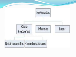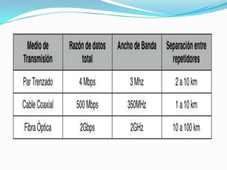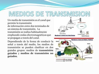 El documento describe diferentes tipos de medios de transmisión, incluyendo cable de par trenzado, cable coaxial, fibra óptica y sus características. Explica que los medios de transmisión permiten la transmisión de información entre dos terminales y pueden ser guiados o no guiados, y proporciona detalles sobre cables de par trenzado, coaxiales y fibra óptica.
