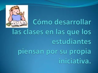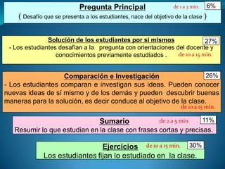 Este documento presenta las 5 fases de una clase activa: 1) Pregunta principal, 2) Solución de los estudiantes por sí mismos, 3) Comparación e investigación, 4) Sumario, y 5) Ejercicios. La clase comienza con una pregunta desafiante relacionada con el objetivo, luego los estudiantes tratan de responderla por su cuenta antes de comparar ideas y llegar a un acuerdo en grupo. Finalmente, el docente resume lo aprendido y los estudiantes practican para fijar el conocimiento.