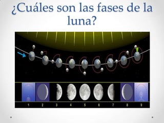 El documento describe las fases básicas de la luna, incluyendo luna nueva, cuarto creciente, luna llena y cuarto menguante. También incluye vocabulario lunar clave e instrucciones para identificar las fases lunares en una imagen y una tarea de investigación sobre fases lunares adicionales.