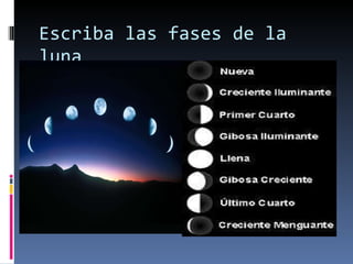 Las fases de la luna son causadas por la posición relativa de la Luna, la Tierra y el Sol. Existen cuatro fases principales: la Luna nueva cuando no está iluminada, el cuarto creciente cuando vemos la mitad iluminada, la luna llena cuando está completamente iluminada, y el cuarto menguante cuando vemos la otra mitad iluminada. Cada fase ocurre aproximadamente una vez por semana a lo largo del ciclo lunar de un mes.