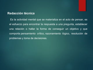 Este documento describe las fases de la redacción técnica. Explica que la redacción requiere planificación, producción y organización de ideas, y escritura del texto. Detalla cuatro pasos elementales: 1) planificar el escrito, 2) producir y organizar las ideas usando técnicas como lluvia de ideas, 3) escribir el borrador, y 4) releer y corregir el texto. Además, enfatiza la importancia de distribuir adecuadamente el tiempo entre estas fases para lograr una redacción efectiva.