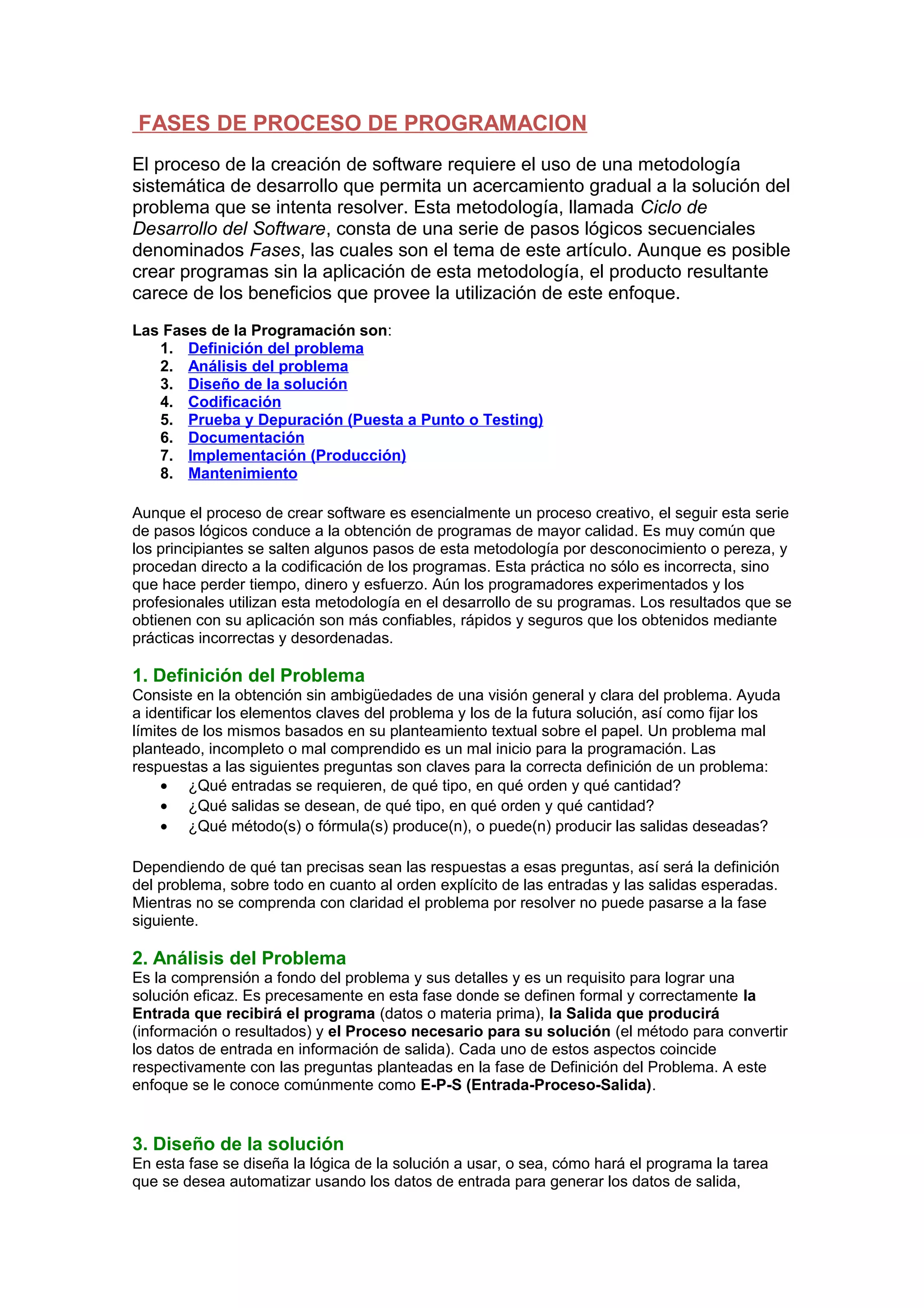 El documento describe las 8 fases del proceso de programación: 1) Definición del problema, 2) Análisis del problema, 3) Diseño de la solución, 4) Codificación, 5) Prueba y depuración, 6) Documentación, 7) Implementación, y 8) Mantenimiento. Siguiendo este proceso sistemático conduce a obtener programas de mayor calidad.