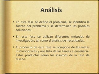 El documento describe las diferentes fases del diseño instruccional: análisis, diseño, desarrollo, implementación, evaluación. En la fase de análisis se define el problema e identifican posibles soluciones. En la fase de diseño se planifica la estrategia para alcanzar las metas instruccionales. Luego, en la fase de desarrollo se elaboran los materiales de instrucción. Finalmente, la instrucción se implementa y evalúa para medir su efectividad.