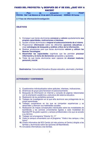El documento describe las tres fases de un proyecto para ayudar a estudiantes de 4o de ESO a elegir su futuro académico y profesional. La primera fase involucra el diseño y planificación del proyecto. La segunda fase se centra en proporcionar información a los estudiantes, ayudarlos con el autoconocimiento y la toma de decisiones. La tercera fase evalúa el progreso del proyecto y los resultados obtenidos.