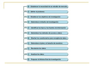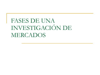 El documento describe las 11 fases de una investigación de mercados. Estas incluyen 1) establecer la necesidad de investigación, 2) definir el problema, 3) establecer objetivos, 4) determinar el diseño, 5) identificar fuentes de información, 6) determinar métodos de acceso a datos, 7) diseñar cuestionarios, 8) determinar el tamaño de muestra, 9) recolectar datos, 10) analizar datos, y 11) preparar el informe final.