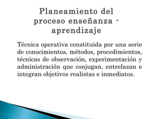El documento presenta los pasos para la planificación didáctica. Estos incluyen la elaboración de objetivos generales y específicos, la selección de contenidos conceptuales, procedimentales y actitudinales, la elección de estrategias de enseñanza, y las etapas del proceso como la motivación, comunicación, análisis, aplicación, síntesis, repetición y evaluación. El propósito es facilitar un proceso de enseñanza-aprendizaje efectivo mediante la integración de objetivos, contenidos y métodos.