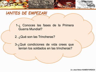 El documento resume las principales fases y eventos de la Primera Guerra Mundial. Inicialmente la guerra involucró movimientos de tropas, pero luego se volvió estática y de trincheras debido a las grandes bajas causadas por la tecnología moderna. Los soldados vivían en malas condiciones en las trincheras. Dos eventos claves que cambiaron el curso de la guerra fueron la Revolución Rusa y la entrada de Estados Unidos al conflicto en 1917. Finalmente, Alemania se rindió en 1918 luego que las tropas