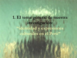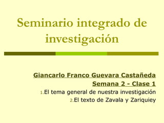 El documento presenta un seminario sobre la investigación del tema "identidad y expresiones culturales en el Perú". Se discute el texto de Zavala y Zariquiey y cómo aborda la relación entre la identidad personal y la discriminación social. En la próxima clase se definirán grupos de investigación y se tratarán temas como delimitar un tema de investigación y plantear una pregunta de investigación.