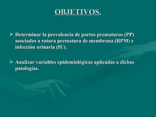 Este estudio examinó la prevalencia de partos prematuros asociados con rotura prematura de membranas (RPM) e infección urinaria (IU) en el Hospital "Ángela I de Llano" en Argentina entre 2008-2009. Los autores no encontraron diferencias estadísticamente significativas entre los grupos RPM e IU con respecto a variables como edad materna, paridad, controles prenatales, escolaridad, índice de masa corporal y periodo intergenésico.