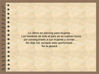 Loúltimo en piercing para mujeres … Los hombres de todo el país se se vuelven locos por conseguírselo a sus mujeres y novias … No deje Ud. escapar esta oportunidad … No le pesará …