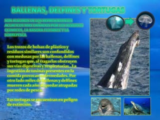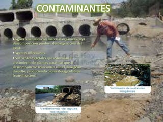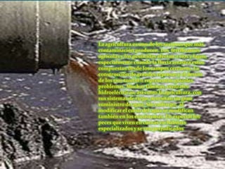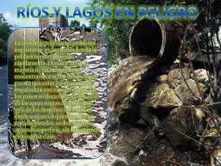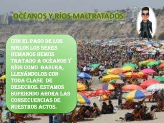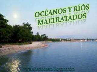 Este documento trata sobre la contaminación de océanos y ríos. Explica que a lo largo de los siglos los seres humanos hemos tratado estos ecosistemas como basureros, llenándolos de desechos. Esto ha amenazado la regulación del clima de la Tierra y está poniendo en peligro muchas especies. También describe el ciclo hidrológico y la importancia de mantener limpios estos cuerpos de agua para preservar el equilibrio del planeta.