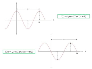 El documento explica que la expresión instantánea de una cantidad senoidal escalar requiere tres parámetros: amplitud, frecuencia y fase. También introduce los fasores como una forma polar de representar cantidades complejas que contienen información de amplitud y fase, e indica que tienen magnitud y fase pero son independientes del tiempo. Además, muestra cómo convertir un voltaje o corriente en un fasor escalar sustituyendo los fasores en ecuaciones de derivadas e integrales.