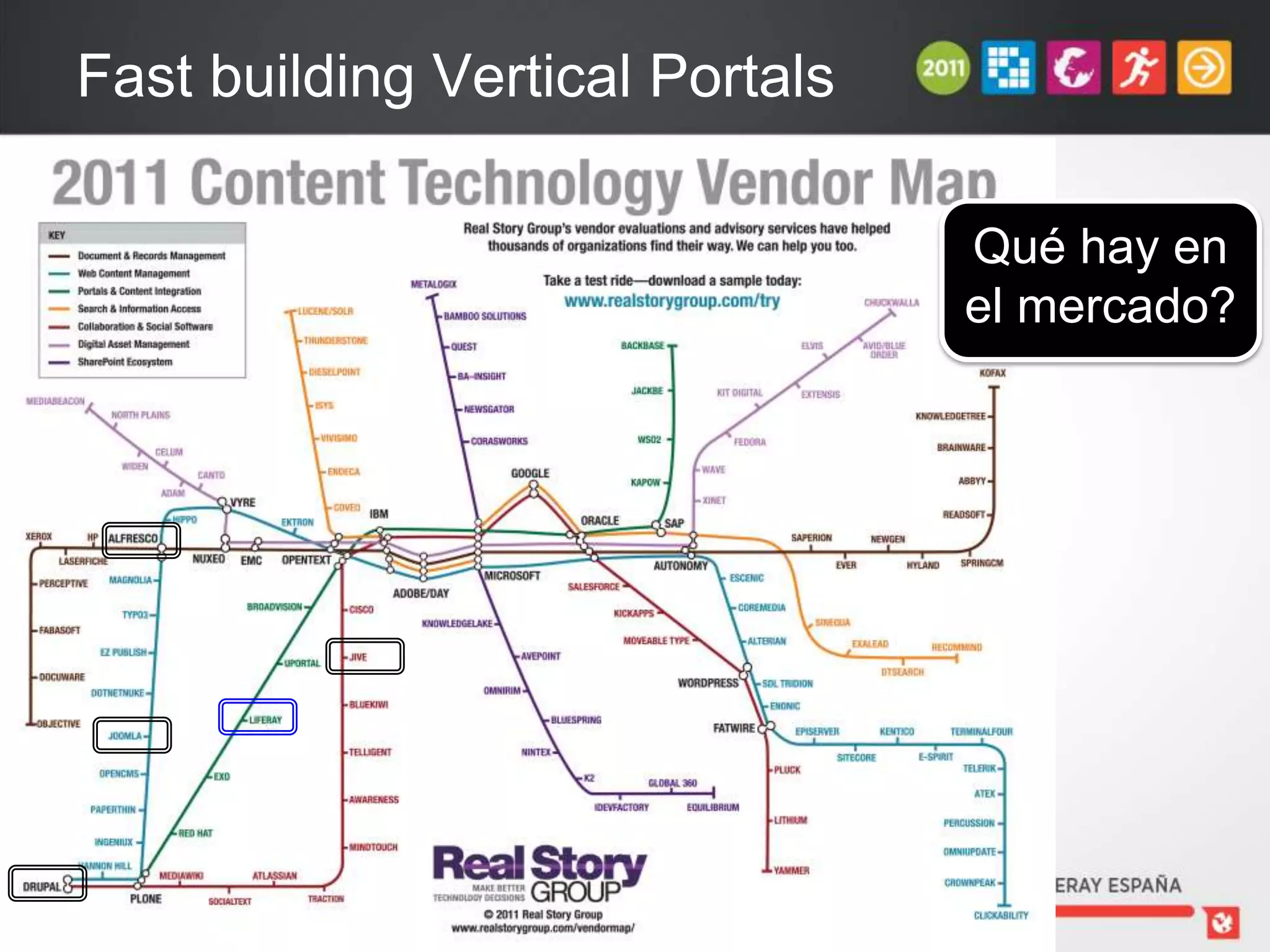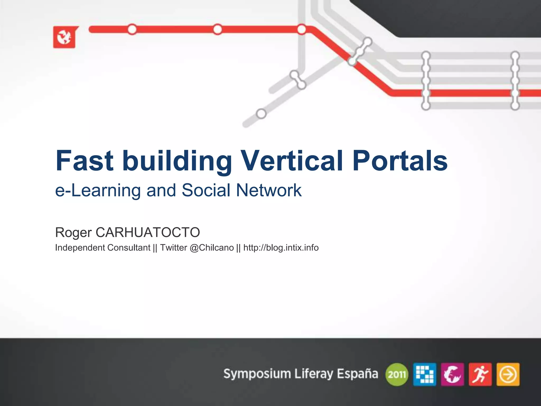 Este documento describe cómo construir portales verticales rápidamente utilizando Liferay. Presenta dos casos: 1) migrar una página de Facebook a Liferay integrando contenido y funcionalidades a través de syndication, mashup e integración. 2) Construir un portal de aprendizaje social e-learning integrando funcionalidades de gestión de aprendizaje de Sakai a Liferay a través de WSRP y agregando capacidades sociales y de producción de contenido de aprendizaje. El documento concluye que se debe aprovechar la plataforma