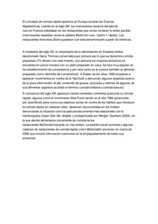 El documento describe la historia y características de la comida rápida. Se originó en el siglo XX con la apertura de los primeros restaurantes automat en Estados Unidos que ofrecían comida detrás de una ventana. En la actualidad, la comida rápida se sirve comúnmente en cadenas de restaurantes homogéneos sin camareros donde los alimentos como hamburguesas y papas fritas se preparan de forma industrial y se consumen sin cubiertos de forma rápida. Aunque práctica, la comida rápida suele ser poco nutrit