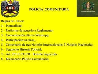 Este documento presenta las reglas y contenido de una clase de Policía Comunitaria en Bolivia. Incluye temas como la puntualidad, el uniforme, la participación, comentarios de noticias y la historia policial. También describe un trabajo práctico sobre la historia de la policía comunitaria y las normativas nacionales e internacionales relacionadas con la seguridad ciudadana y el modelo de policía comunitaria en Bolivia.