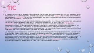 El documento define las tecnologías de la información y la comunicación (TIC) y discute la importancia de planificar y gestionar la infraestructura TIC de una organización. Explica que los profesionales de TIC combinan conocimientos técnicos y habilidades de gestión para seleccionar el hardware y software adecuados para una organización, integrarlos con las necesidades organizativas e instalar, adaptar y mantener sistemas de información seguros y efectivos.