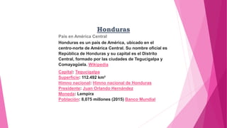 Honduras es un país centroamericano cuya capital es Tegucigalpa. Algunos de los principales lugares turísticos de Honduras incluyen las Islas de la Bahía, con sus playas paradisíacas; la ciudad de Tela y sus playas de arenas blancas; las Ruinas Mayas de Copán, declaradas Patrimonio de la Humanidad; y la Reserva de la Biosfera Río Plátano, hogar de una rica biodiversidad.