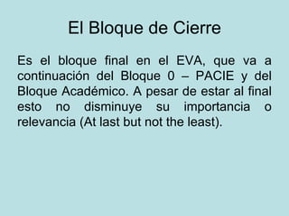 El documento describe la estructura y elementos del Bloque de Cierre en un curso de E-Learning. El Bloque de Cierre se encuentra al final del curso y contiene palabras de agradecimiento, un foro social, un enlace a los certificados, y una retroalimentación general y específica del curso.