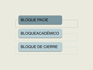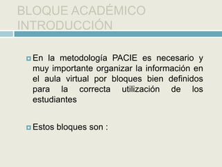 El documento describe la sección académica de un curso en línea diseñado según la metodología PACIE. La sección académica contiene cuatro subsecciones: exposición, rebote, construcción y comprobación. La sección de exposición presenta los contenidos del curso a través de recursos como documentos PDF y enlaces web. La sección de rebote incluye actividades como cuestionarios para que los estudiantes verifiquen su comprensión. La sección de construcción utiliza foros para permitir el debate y discusión. Finalmente,